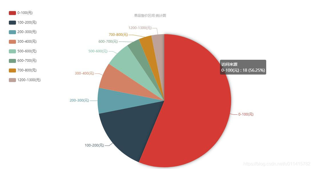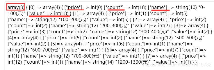 $titleArr = []; //$res 为前面得到的数据 foreach ($res as $key => $value){ $price = $value['price']; if ($price > 0){ $price_range = $price."00-".intval($price+1)."00(元)"; }else{ $price_range = "0-".intval($price+1)."00(元)"; } $res[$key]['name'] = $price_range; $res[$key]['value'] = $value['count']; $titleArr[] = $price_range; }- 得到的数据如下: